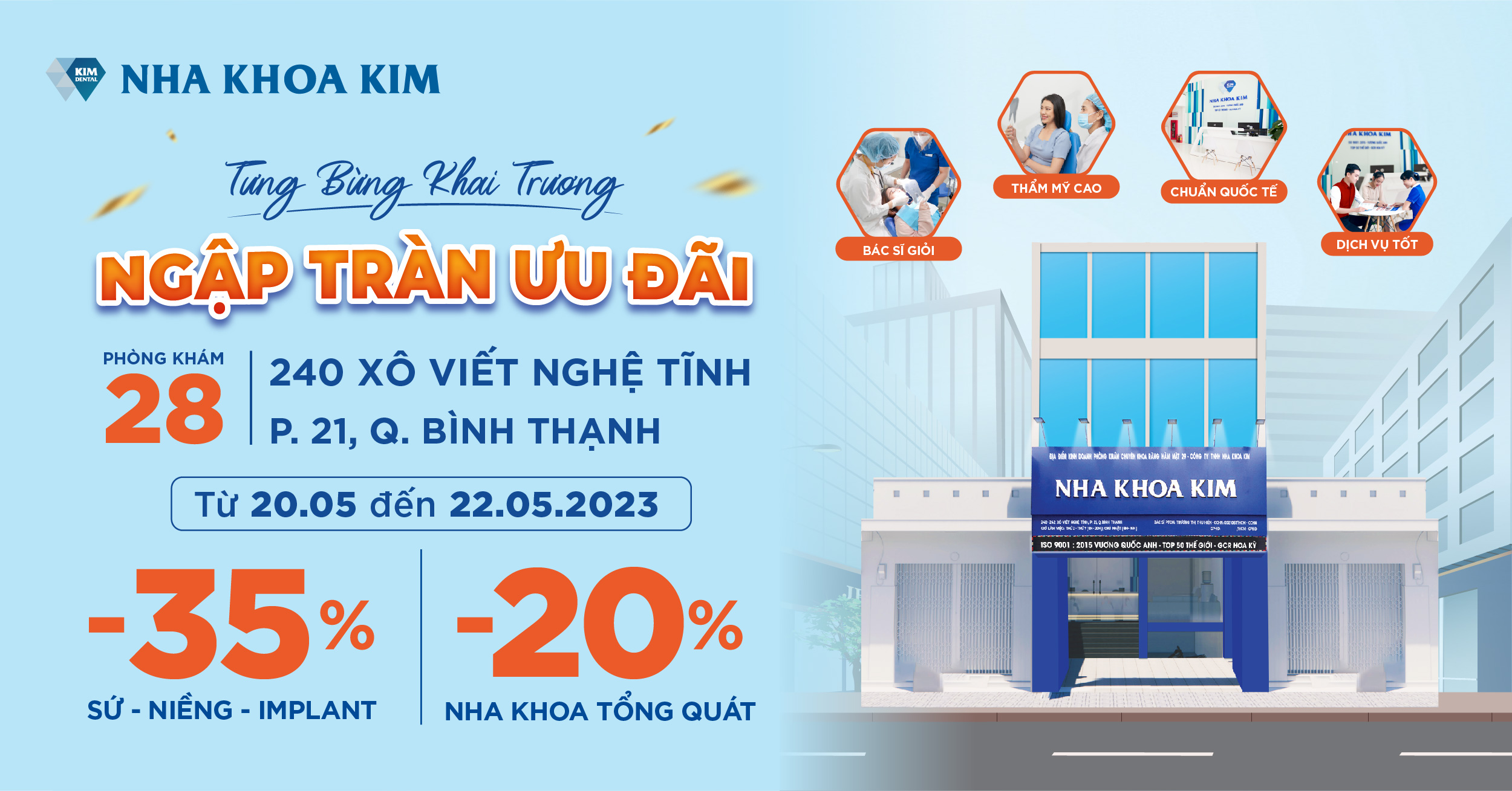 Ngày 20/05/2023, Nha Khoa Kim sẽ chính thức khai trương phòng khám nha khoa chuẩn quốc tế thứ 28 tại 240 Xô Viết Nghệ Tĩnh, P.21, Q. Bình Thạnh, TP.HCM. Hãy đến chăm sóc răng miệng và nhận ngay những ưu đãi hấp dẫn nhé!