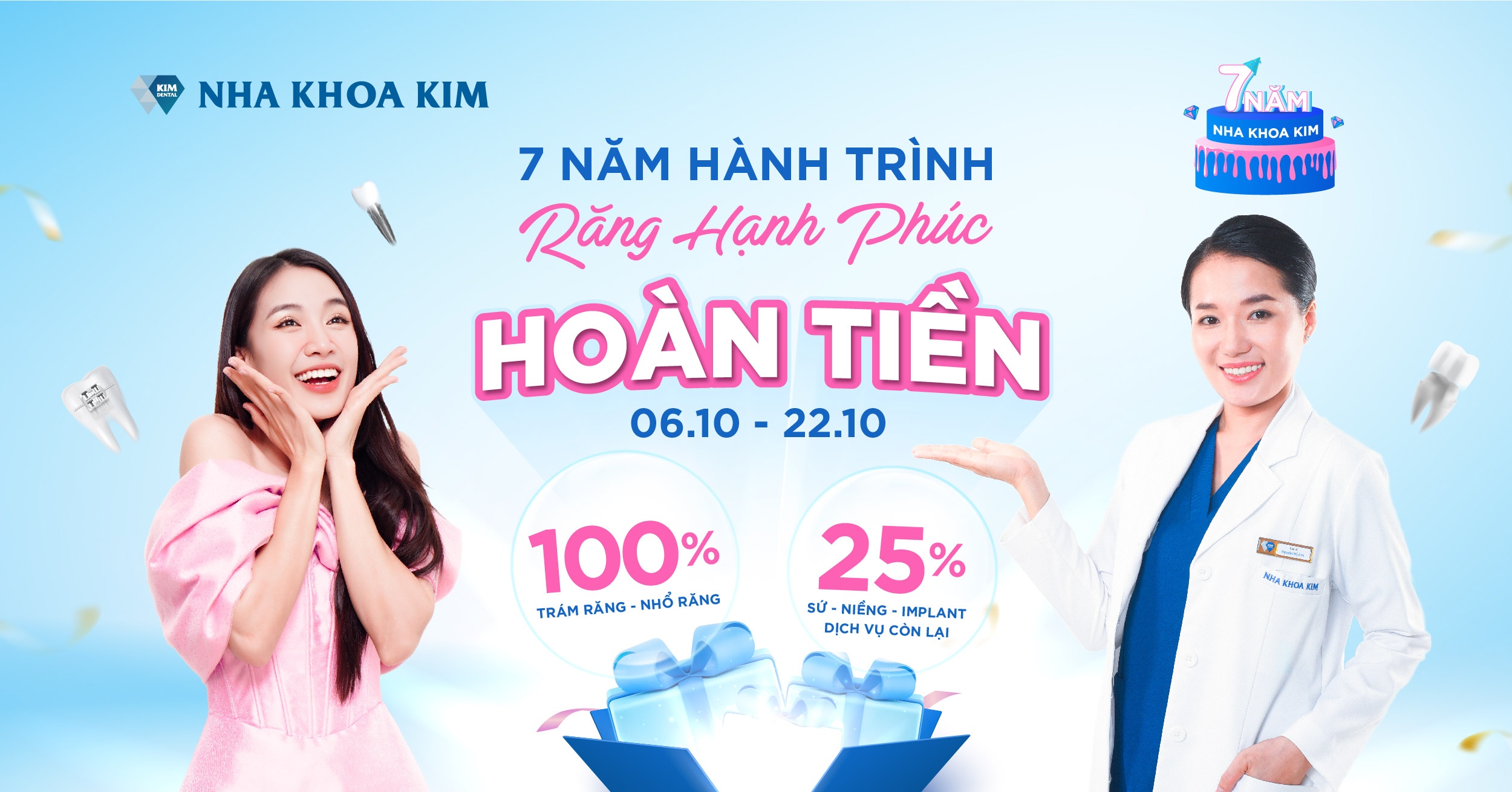 Mừng sinh nhật 7 tuổi, từ ngày 6/10 – 22/10, Nha Khoa Kim gởi tặng bạn ưu đãi hấp dẫn nhất trong năm, như một món quà tri ân gởi đến khách hàng và mang đến cơ hội cho tất cả mọi người được trải nghiệm dịch vụ nha khoa chuẩn quốc tế: